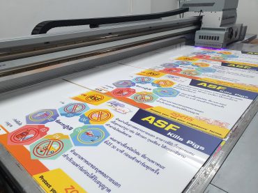 งานพิมพ์ป้ายแจ้งเตือนอะคริลิคสีขาวพร้อมเจาะรู ติดตั้งในฟาร์ม 200 แผ่น อะคริลิคความหนา 3 มม. ตัดเลเซอร์ กว้าง 100 x สูง 50 เซนติเมตร พิมพ์ลงแผ่นอะคริลิคได้โดยตรง ด้วยระบบดิจิตอล cmyk lc lm + w + v ได้ทุกสี